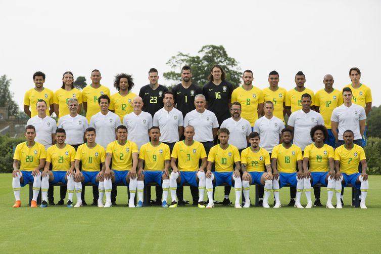 Em pé: Marquinhos, Filipe Luis, Danilo, Marcelo, Ederson, Alisson, Cássio, Renato Augusto, Casemiro, Paulinho, Fernandinho e Geromel.