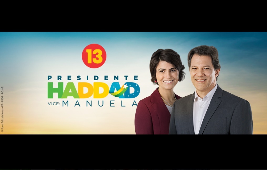 O vermelho limita-se a um detalhe em que o número 13 aparece em cor amarela. Na foto oficial, Haddad e sua vice, Manuela D’Ávila (PCdoB), usam blazer. Ele, azul. Ela, bordô. Em azul, está a inscrição “Todos pelo Brasil”. Figura central no primeiro turno, Lula não aparece mais.