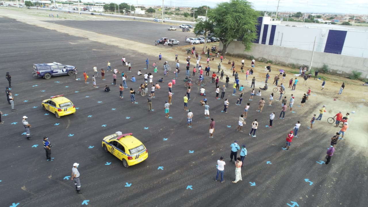Foram feitas 500 marcações no chão, que estão posicionadas a 2 metros de distância uma da outra. A fila começa na porta da agência e segue pelo atual Pátio de Eventos do município – antigo Ceape. A escolha do direcionamento para o pátio foi para prevenir acidentes, visto que, em alguns dias de maior movimento, as pessoas chegaram a invadir parte da pista da avenida na formação da fila.