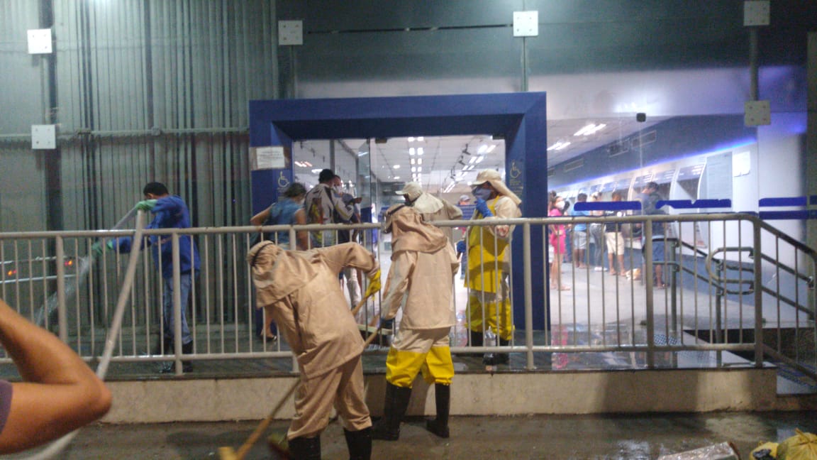 As ruas e acessos às agências do centro e da Avenida Sete de Setembro, como também o Banco do Nordeste, foram lavadas e em seguida limpas com uma solução de água, cloro e água sanitária. O principal foco são os bancos nos quais há maior concentração de pessoas.
