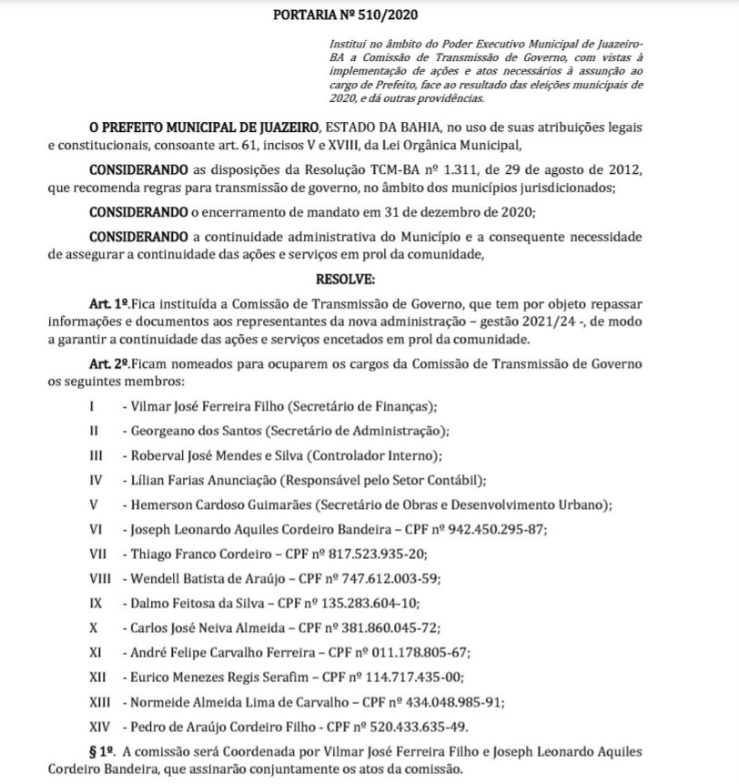 Definida equipe de transmissão de governo na Prefeitura de Juazeiro