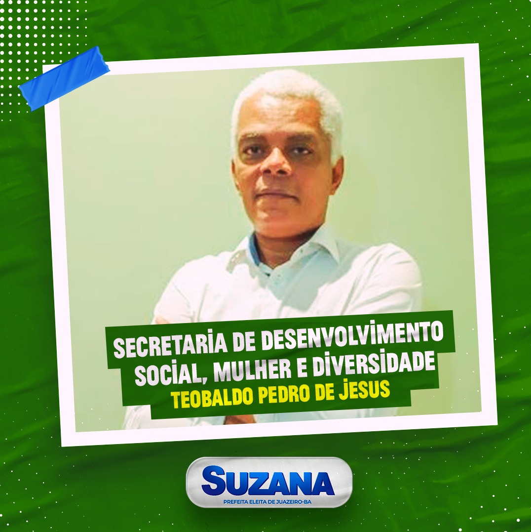 A prefeita eleita em Juazeiro (BA), Suzana Ramos (PSDB), segue divulgando seu futuro secretariado através das redes sociais. O secretário da vez é Teobaldo Pedro de Jesus, que assumirá a Secretaria de Desenvolvimento Social, Mulher e Diversidade.