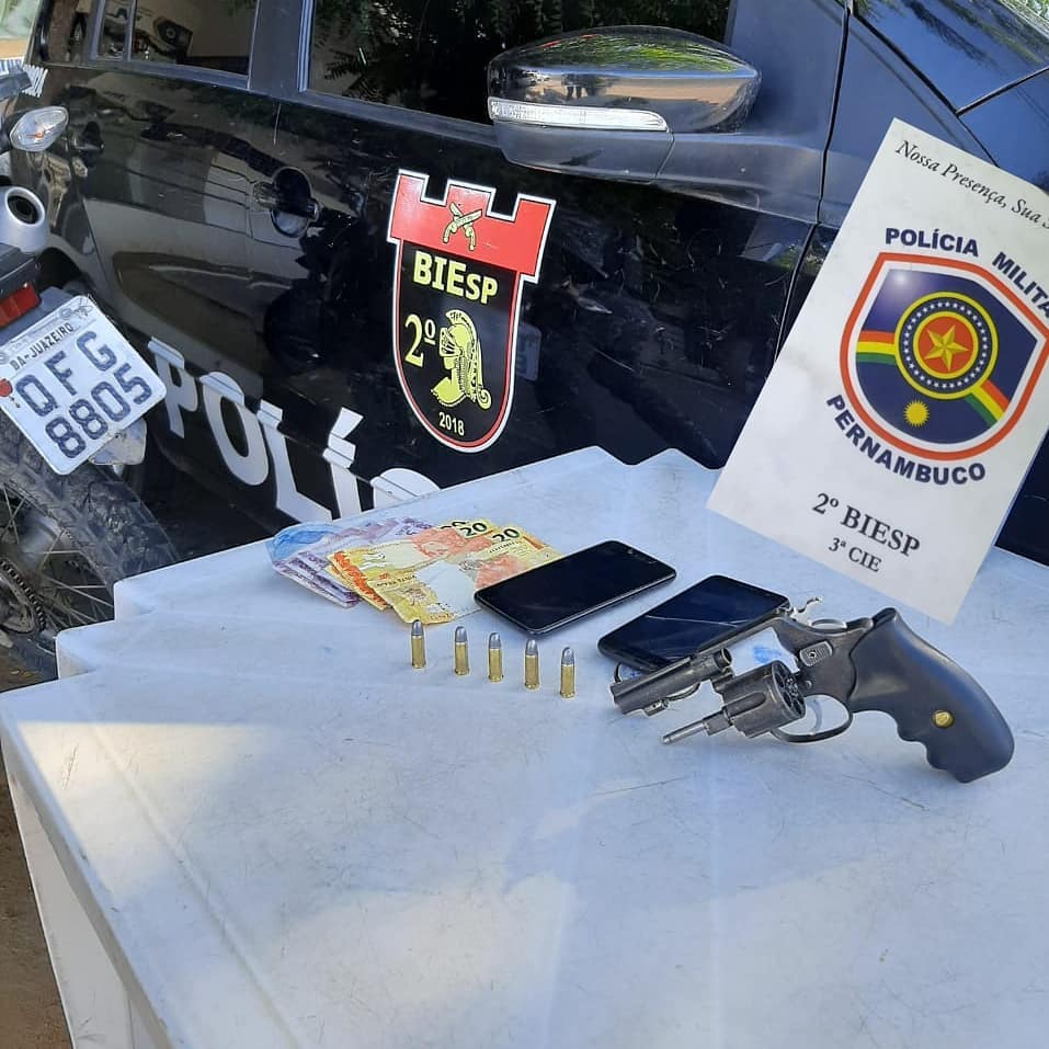 Nesta terça-feira (20), por volta das 15:30h, policiais militares do 2°BIEsp, após receberem informações de que dois homens haviam praticado roubo com emprego de arma de fogo no Projeto N1, diligenciaram com o intuito de localizar os suspeitos quando, no bairro João de Deus, visualizaram 2 indivíduos com as mesmas características repassadas pela central de rádio. Emanada ordem de parada, os militares encontraram um Revólver Calibre. 32 com cinco munições intactas nas vestes do garupa, além dos produtos do roubo.