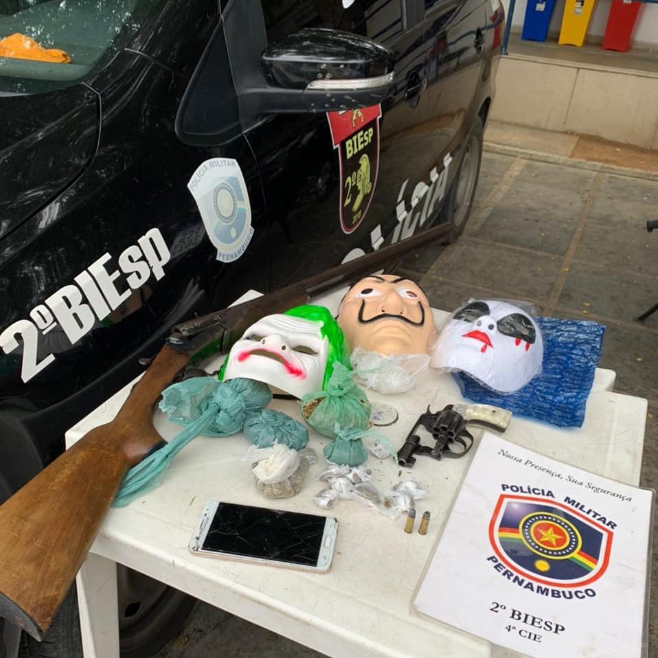 A primeira apreensão ocorreu por volta das 10h30 no bairro Nova Vida. Dada a suspeição de um indivíduo, os policiais procederam abordagem policial, oportunidade em que o indivíduo empreendeu fuga, pulando o muro de uma residência. Na empreitada fugitiva, abandonou uma mochila com 1 revólver calibre .32 com 2 munições, 124g de cannabis sativa (maconha), além de 4 máscaras. No quintal da casa, enrolada em um lençol, restou localizada, também, uma espingarda calibre 12.