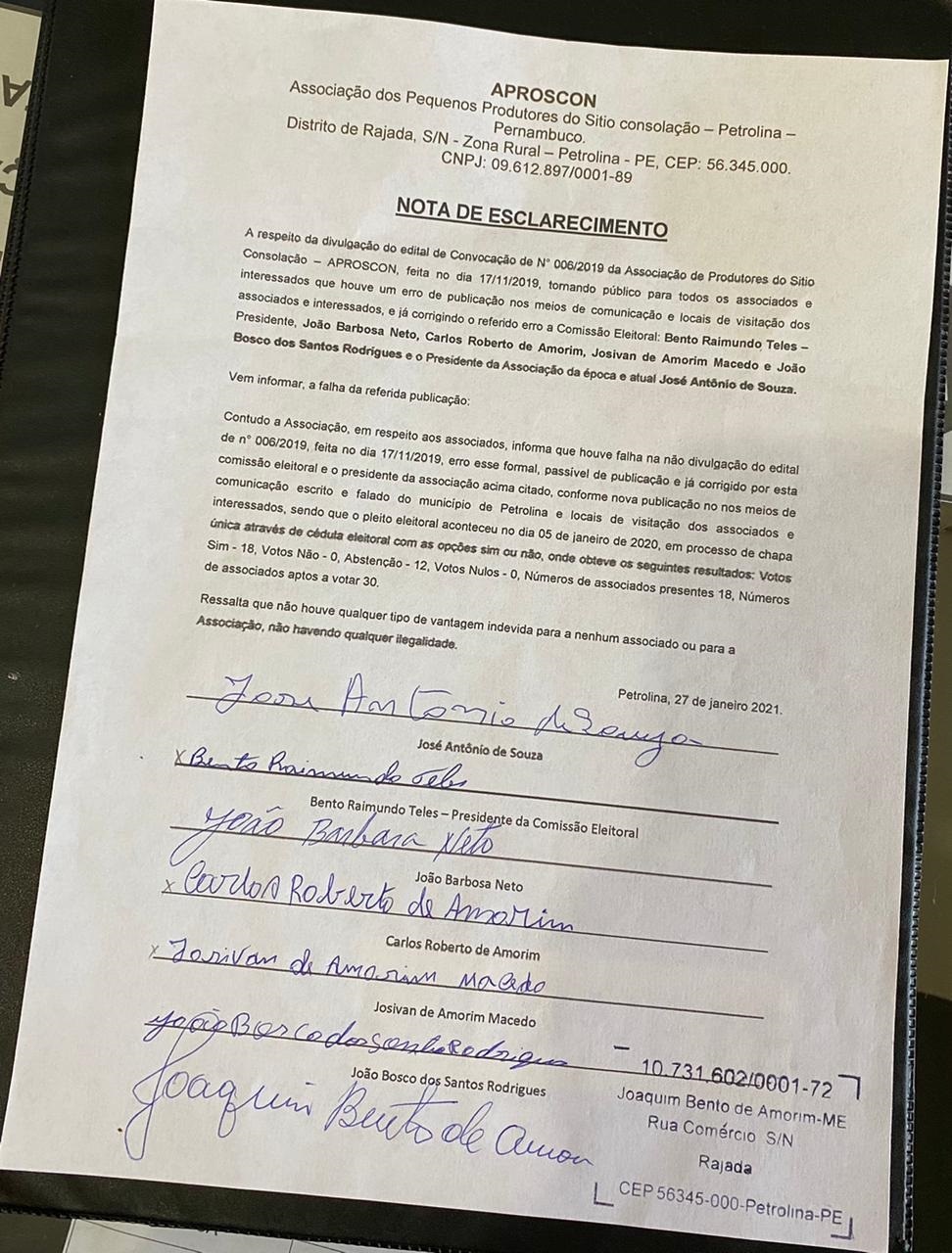 Bento Raimundo Teles (presidente), João Barbosa Neto, Carlos Roberto de Amorim, Josivan de Amorim Macedo e Bosco dos Santos Rodrigues fizeram parte da comissão Eleitoral. A unidade é formada por pequenos agricultores que buscam apoio junto às forças municipal e estadual com o objetivo de fortalecer o trabalho na comunidade. A data do documento com a nota de esclarecimento é do dia 27 de janeiro de 2021. Veja documento abaixo:
