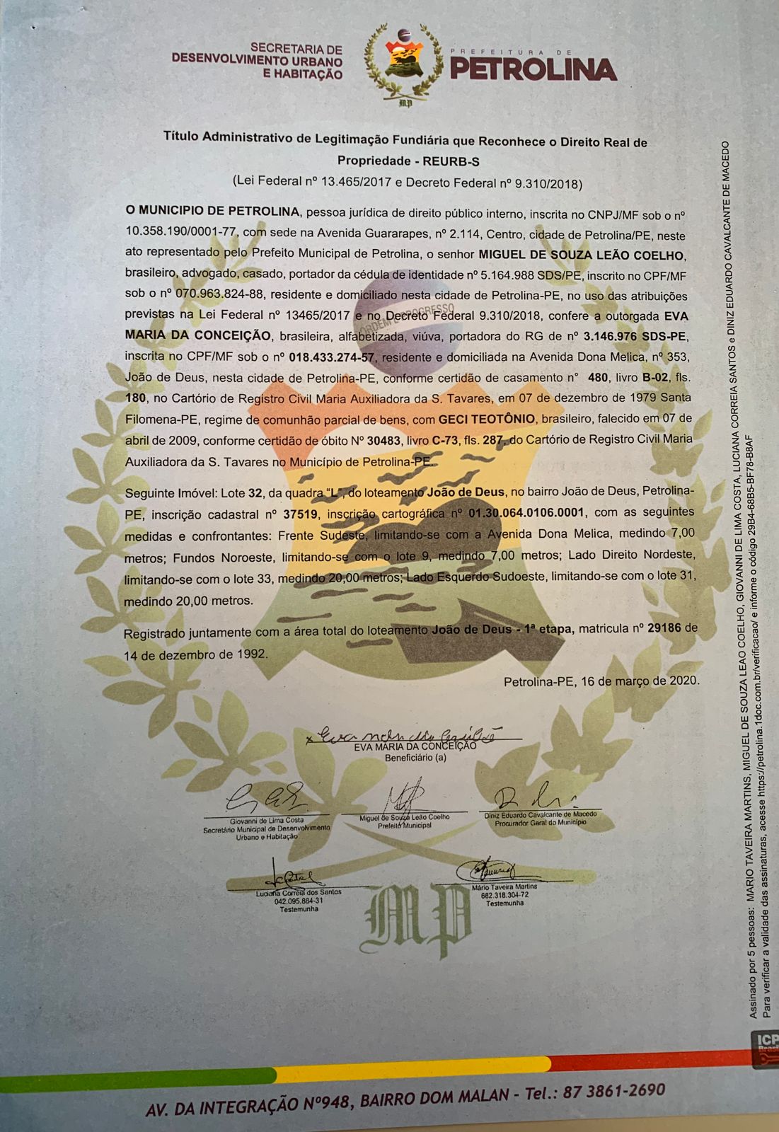 Já pensou ouvir a campainha tocar e ao abrir a porta receber o documento da sua casa, conquistada com muito suor há tantos anos, que ainda não havia sido regularizada? Em Petrolina essa ação tem sido uma realidade. Quem deu entrada no processo para emissão do documento do imóvel, através da prefeitura, está recebendo o título de posse em domicílio.