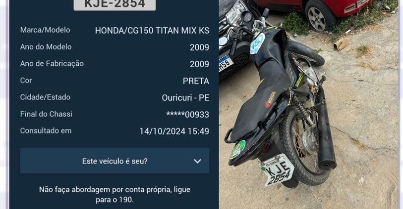 Na tarde desta segunda-feira (14), por volta das 14h35, policiais militares do 7º Batalhão de Polícia Militar (BPM) realizaram uma ação de patrulhamento ostensivo na BR-316, no município de Ouricuri-PE, que resultou na apreensão de uma motocicleta clonada e com restrição de roubo/furto.