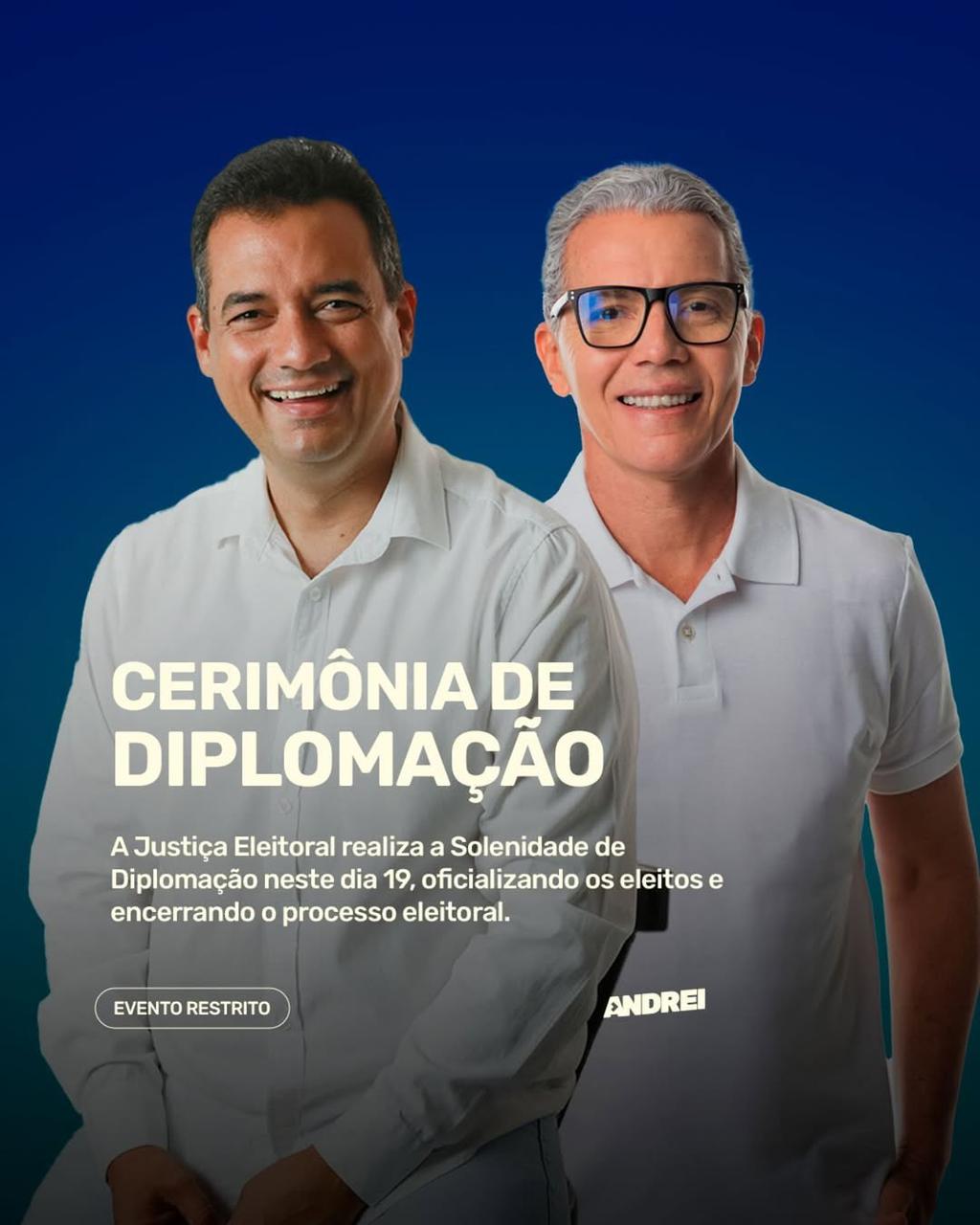 Na próxima quinta-feira (19), às 17h, o prefeito eleito de Juazeiro, Andrei Gonçalves, o vice-prefeito Tiano Félix e os vereadores eleitos serão diplomados...