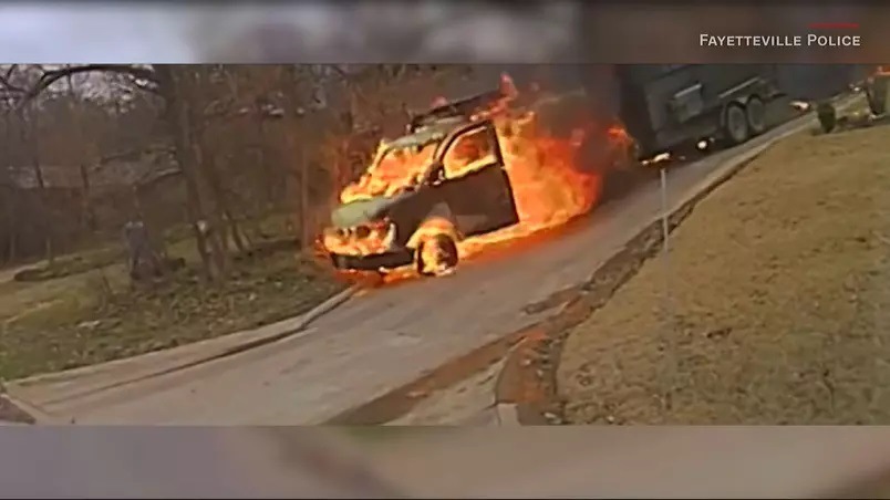 Moradores de uma cidade dos Estados Unidos se surpreenderam com uma van em chamas que desceu uma colina. Imagens da câmera de uma viatura mostram...