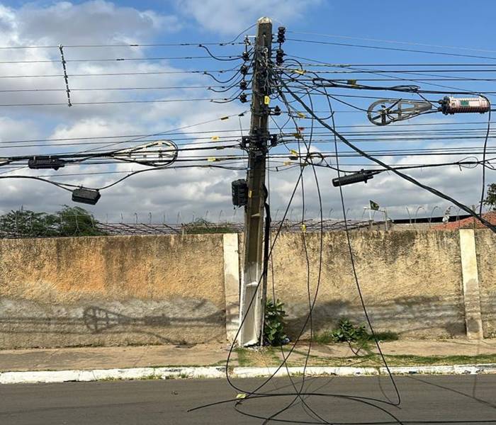 Um poste com a fiação caída está provocando transtornos no trânsito nas proximidades da Avenida dos Tropeiros e da garagem da Gontijo, em...